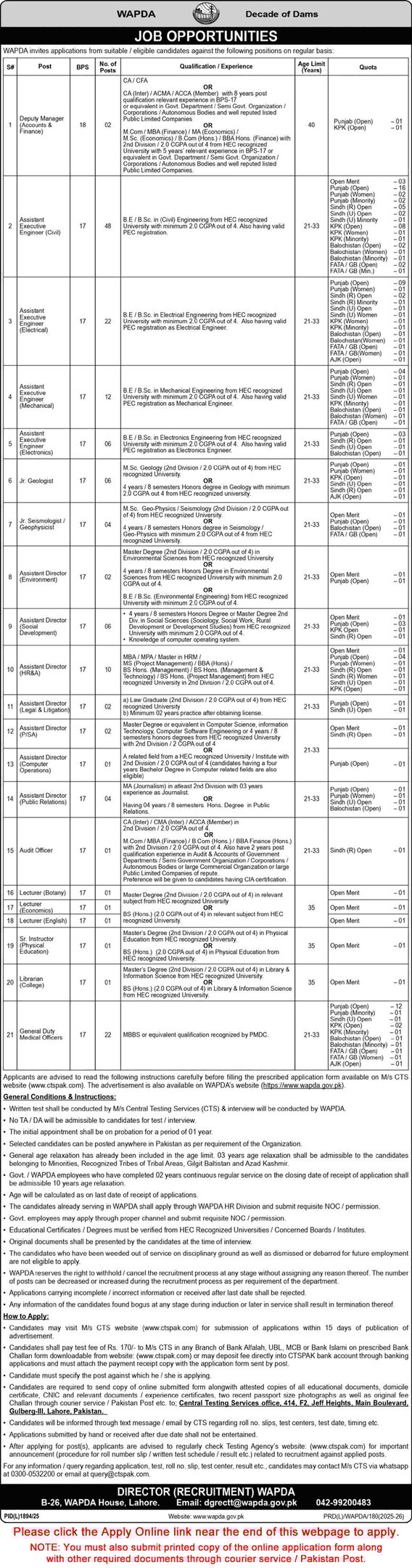 WAPDA Jobs 2026 CTS Online Application Form Water and Power Development Authority